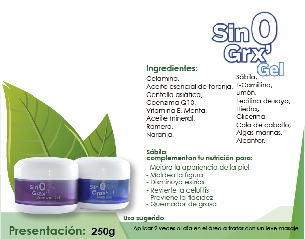 SIN 0 GRX’ GEL es una combinación de plantas y minerales que forman un gel corporal, hecho específicamente para darle una mejor apariencia a tu piel. Pero más alla de darle una buena apariencia, una mejor salud previniendo, tratando y revirtiendo problemas como: toxinas, estrías, celulitis y flacidez. También es un excelente oxigenador de la piel, quemador de grasa y moldeador de tu figura.