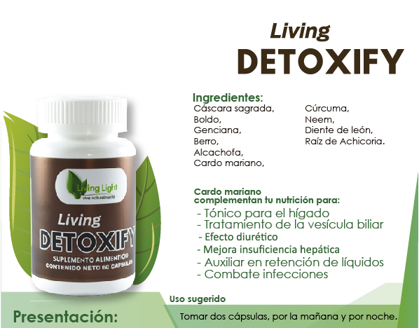 El hígado es un órgano vital en nuestro organismo, el segundo en importancia. Su buen funcionamiento tiene gran influencia en nuestra digestión, salud y bienestar general. Incluso un dolor de cabeza puede ser resultado de un mal funcionamiento hepático, que puede deberse a muchas causas. Dada la gran cantidad de comidas no saludables, excesos, medicamentos y sustancias tóxicas que nos afectan hoy día, es fundamental proteger su funcionamiento. Ayude a protegerlo naturalmente con LIVING DETOXIFY un suplemento basado en plantas medicinales y aminoácidos que ayudan a mejorar el funcionamiento del hígado.
